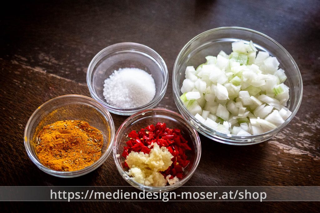 1. Schüssel mit Kurkuma, Kala Jeera, Garam, Masala, Panch Phoron, Chili Hot, Kreuzkümmel; 2. Schüssel mit kleingeschnittener Chilischote, gewürfeltem Ingwer, zerdrücktem Knoblauch; 3. Schüssel mit Salz und Zucker; 4. Schüssel mit kleingeschnittener Zwiebel