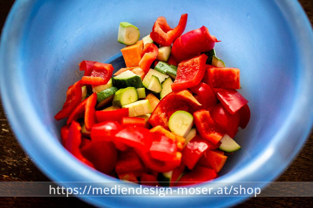 Süßkartoffel, Zuchhini, Paprika in mundgerechte Stücke schneiden.