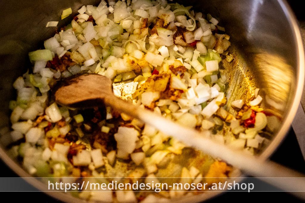 Butterschmalz erhitzen, darin zunächst Ingwer, Knoblauch, Chili, Gewürzschüssel Nr 1 anbraten. Zwiebel Hinzufügen