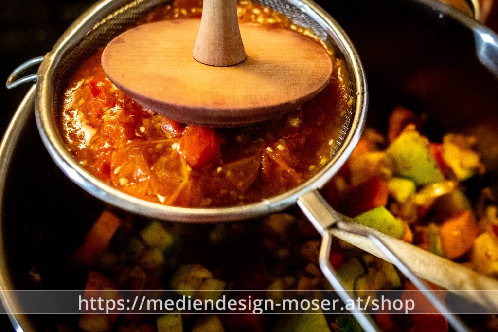 Wenn du frische Tomaten verwendest in einem anderen Gefäß erhitzen und dann durch ein Sieb passieren. Wenn du Dosentomaten nimmst diese einfach hinzufügen