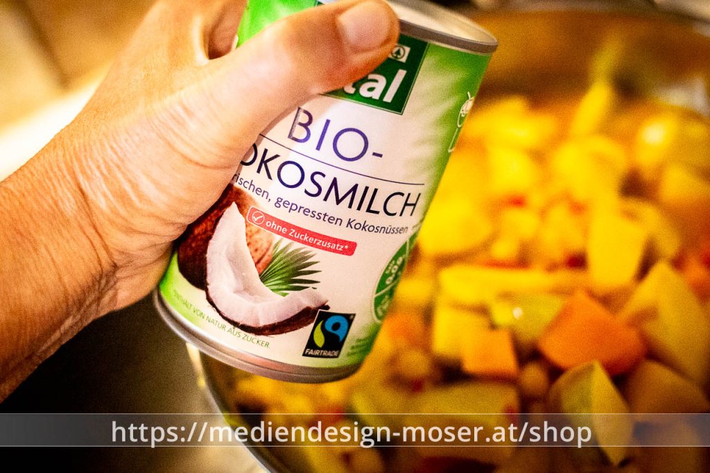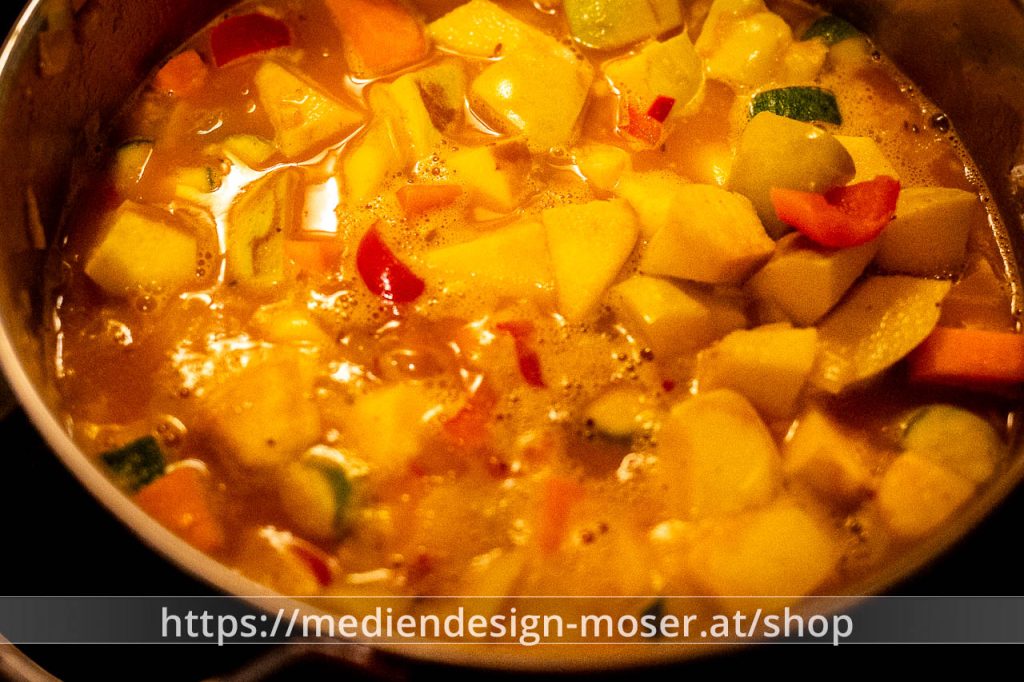 Kokosmilch hinzufügen und kräftig einkochen bis alles Gemüse weich ist.