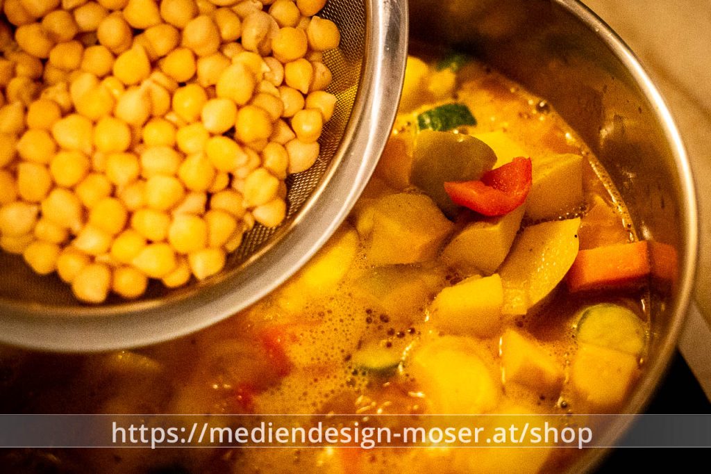 Am nächsten Tag: Kichererbsen reichlich abspülen in frischem Salzwasser auf den Herd geben und weich kochen.
