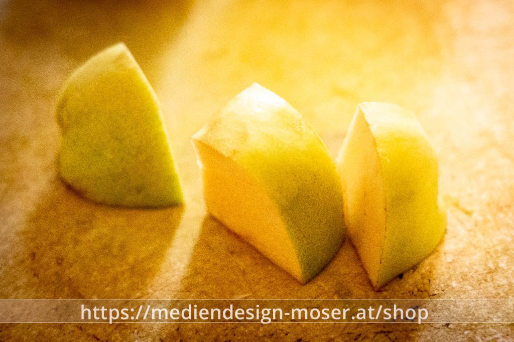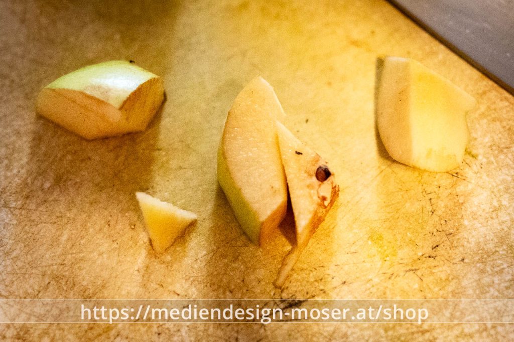 Zunächst halbieren, dann nochmals habieren, Kerngehäuse wegschneiden bis passende Stücke vorhanden sind