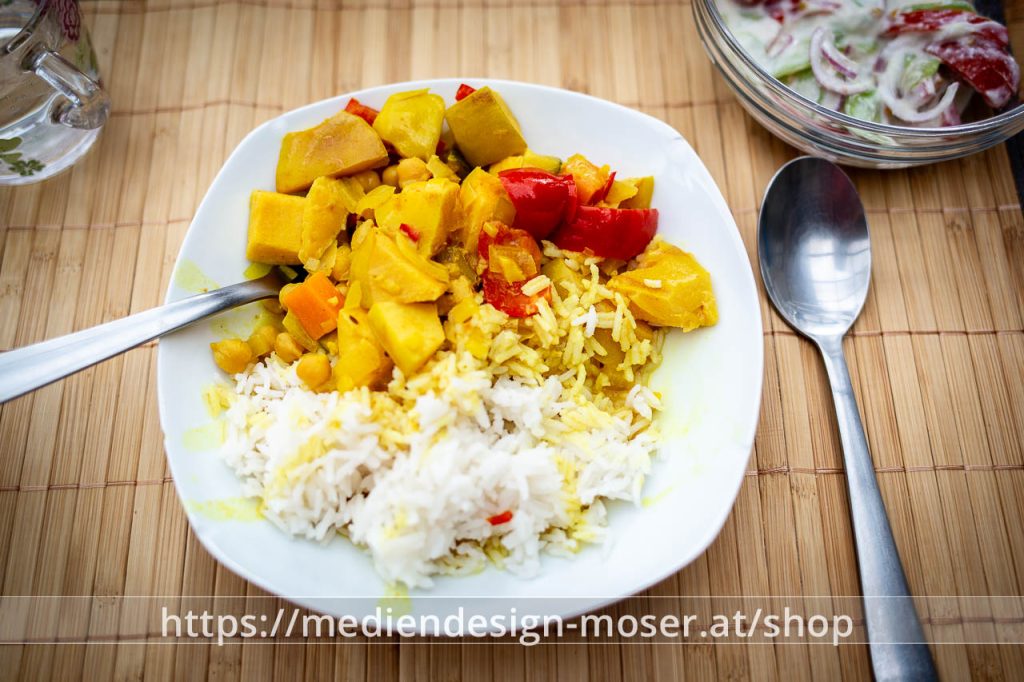 Als Beilage passt Reis und indischer Salat (kleingeschnittene Zwiebeln, Tomaten, Gurke mit Joghurt und Kreuzkümmel verrühren)