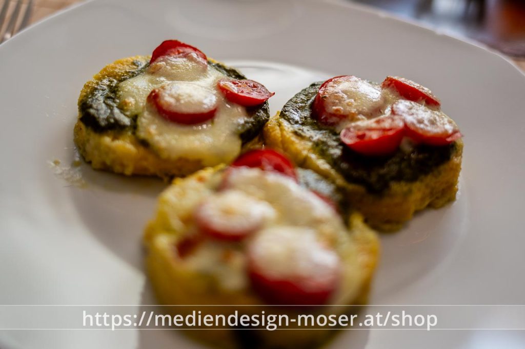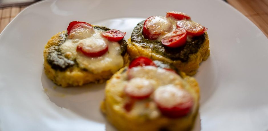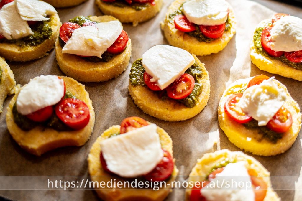 Polentataler jeweils mit einem Klecks Pesto belegen, darauf ein Tomatenstück, darüber ein Mozarellastück.