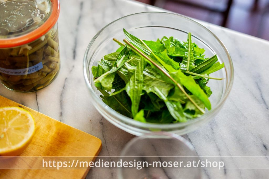Wildkräuter-Salat: Löwenzahn und Spitzwegerich (und weitere Wildkräuter wie Zitronenmelisse) waschen und klein schneiden. Marinieren (mit Essig, Zitrone, Senf Salz und Olivenöl)