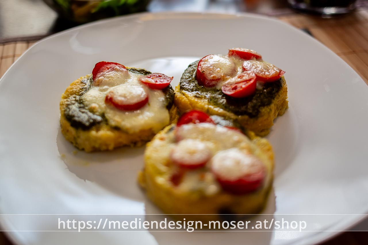Polentataler jeweils mit einem Klecks Pesto belegen, darauf ein Tomatenstück, darüber ein Mozarellastück.